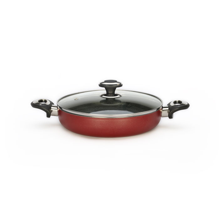مقلاة جرانيتا بمقبضين من زر ساب، مع غطاء زجاجي وطلاء مقاوم للالتصاق، تصميم عملي ومتين لمطبخك.
